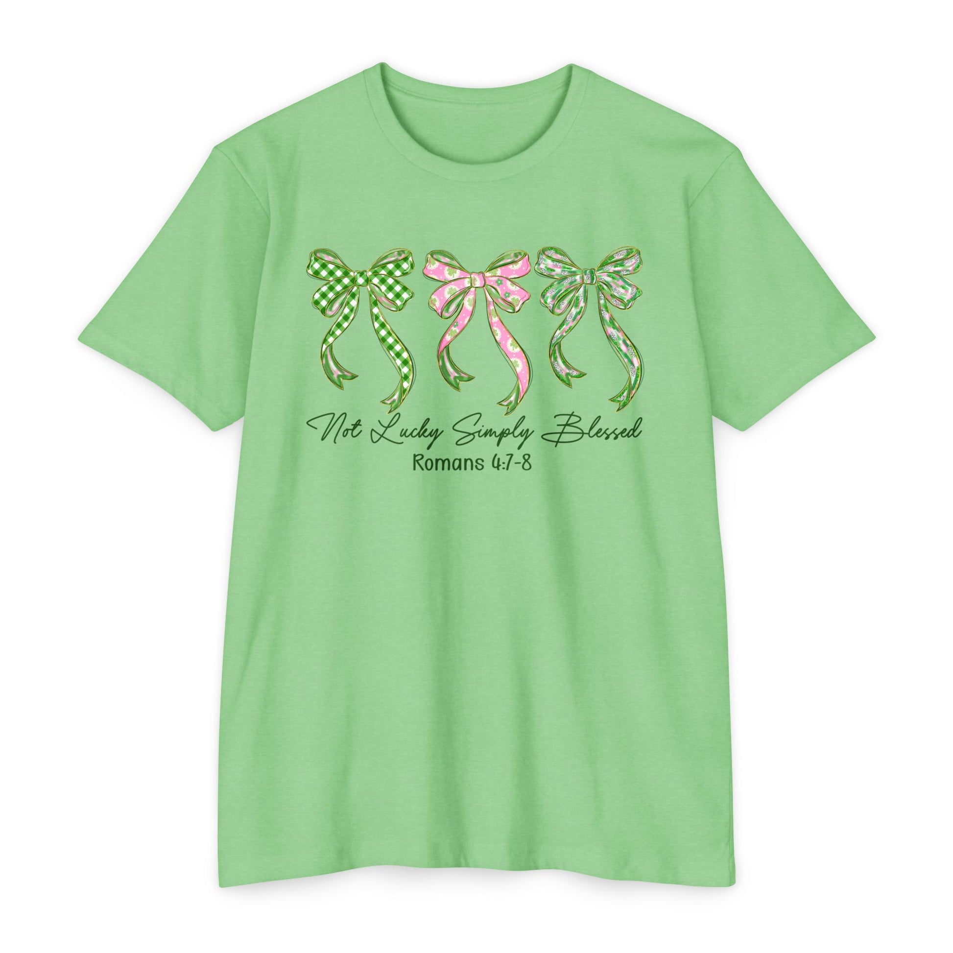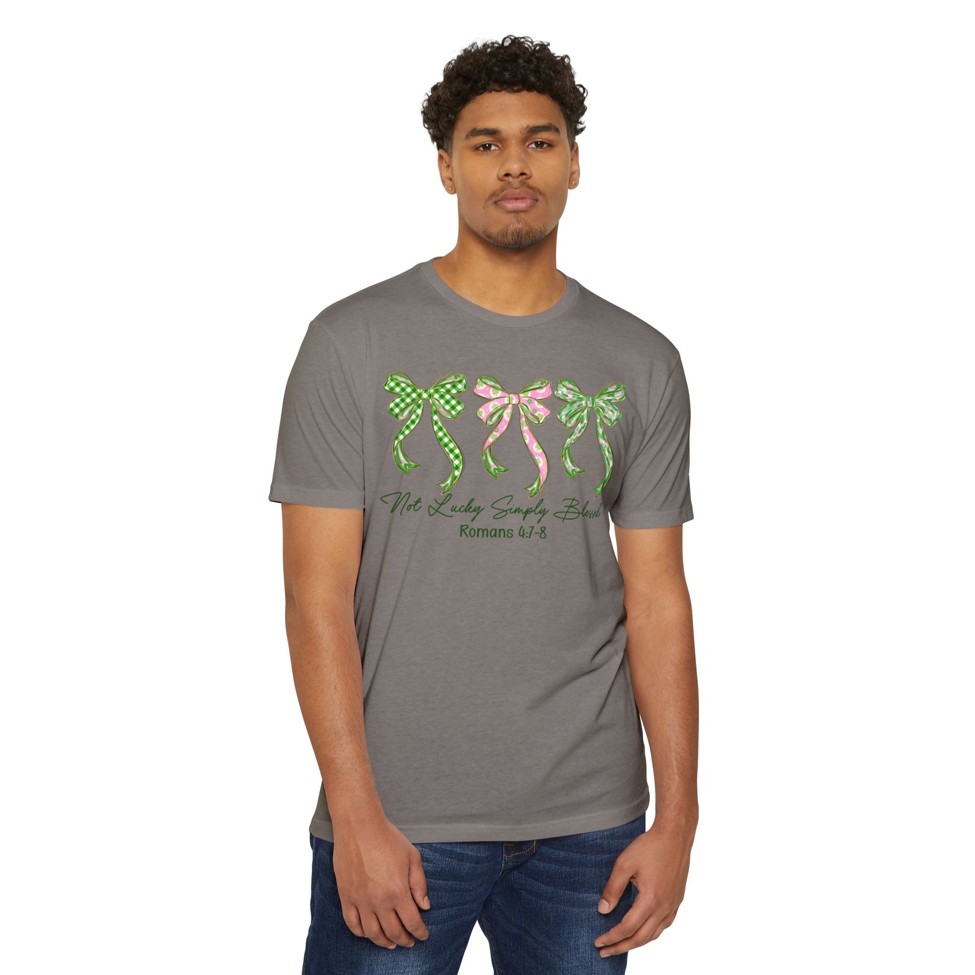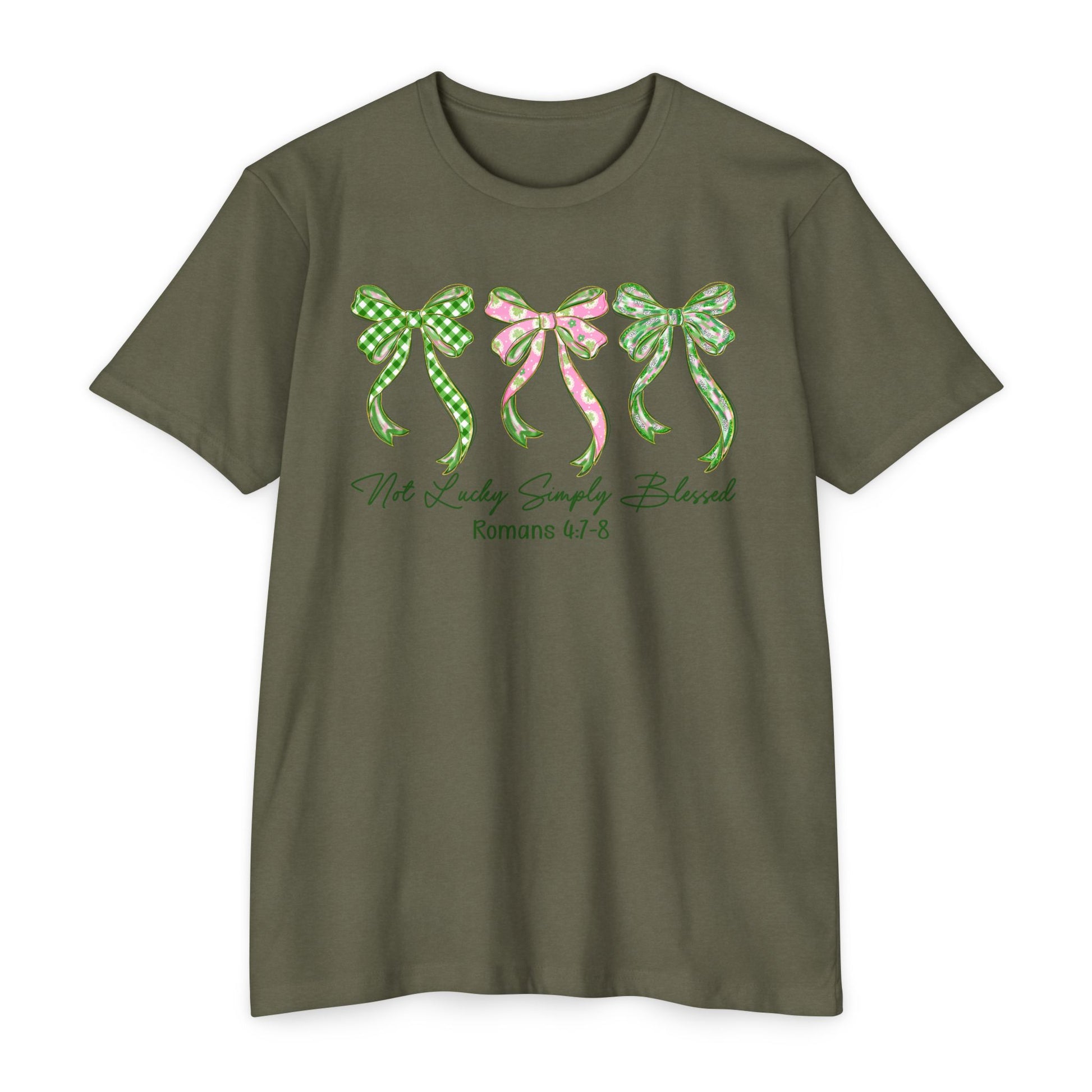 Soft, light, and quietly expressive — this tee carries a gentle charm. Three hand-drawn bows in coordinating green and pink patterns sit across the chest, their ribbon tails drifting like whispered promises. Beneath them, a delicate script reference adds a thoughtful, faith-leaning touch without shouting. The muted olive-gray base keeps the look grounded and wearable every day.