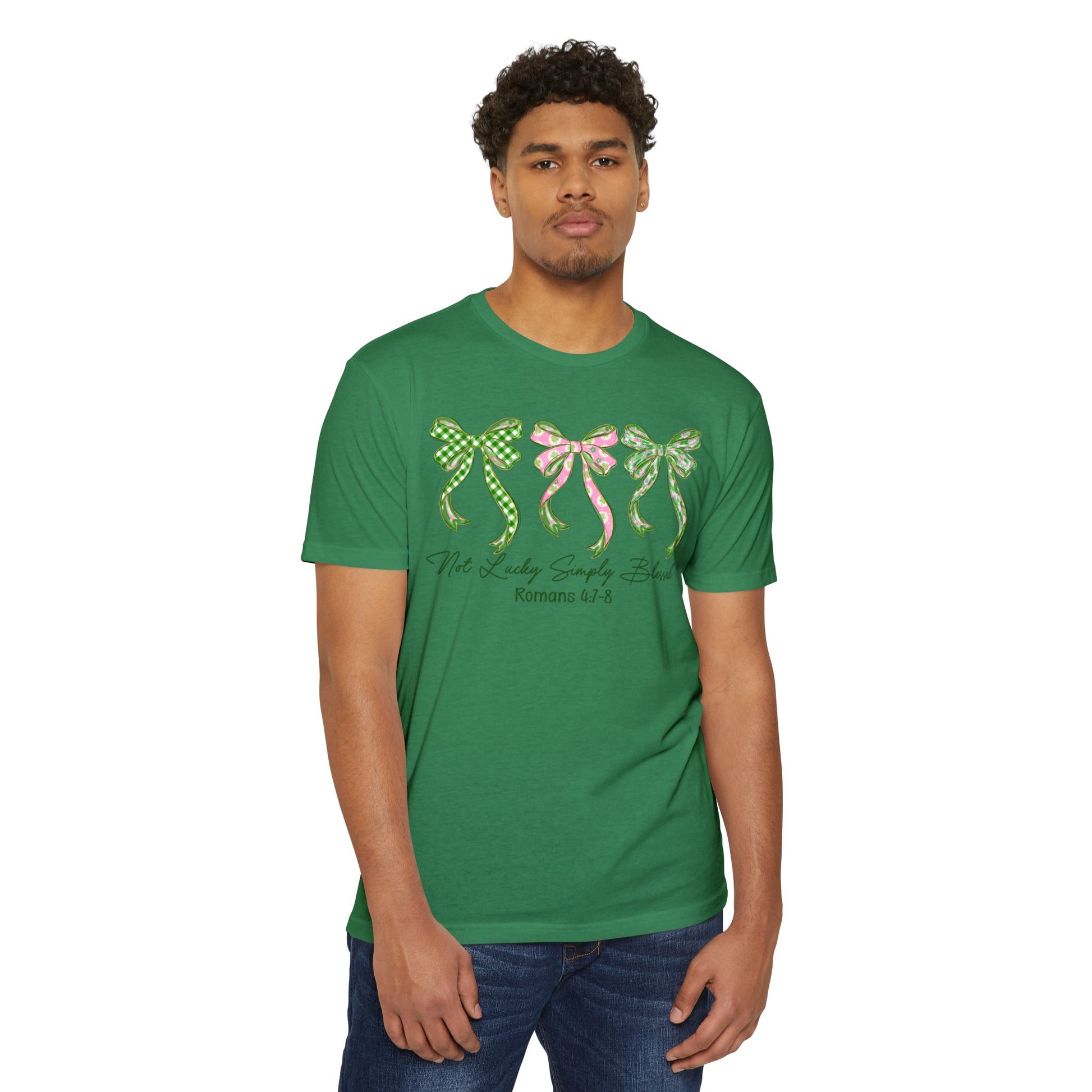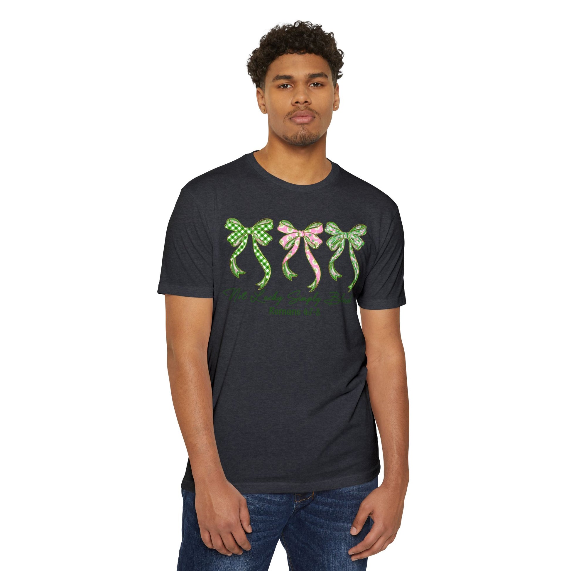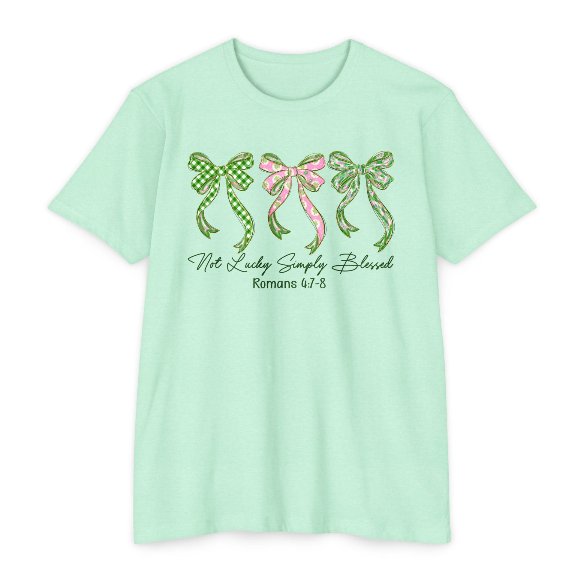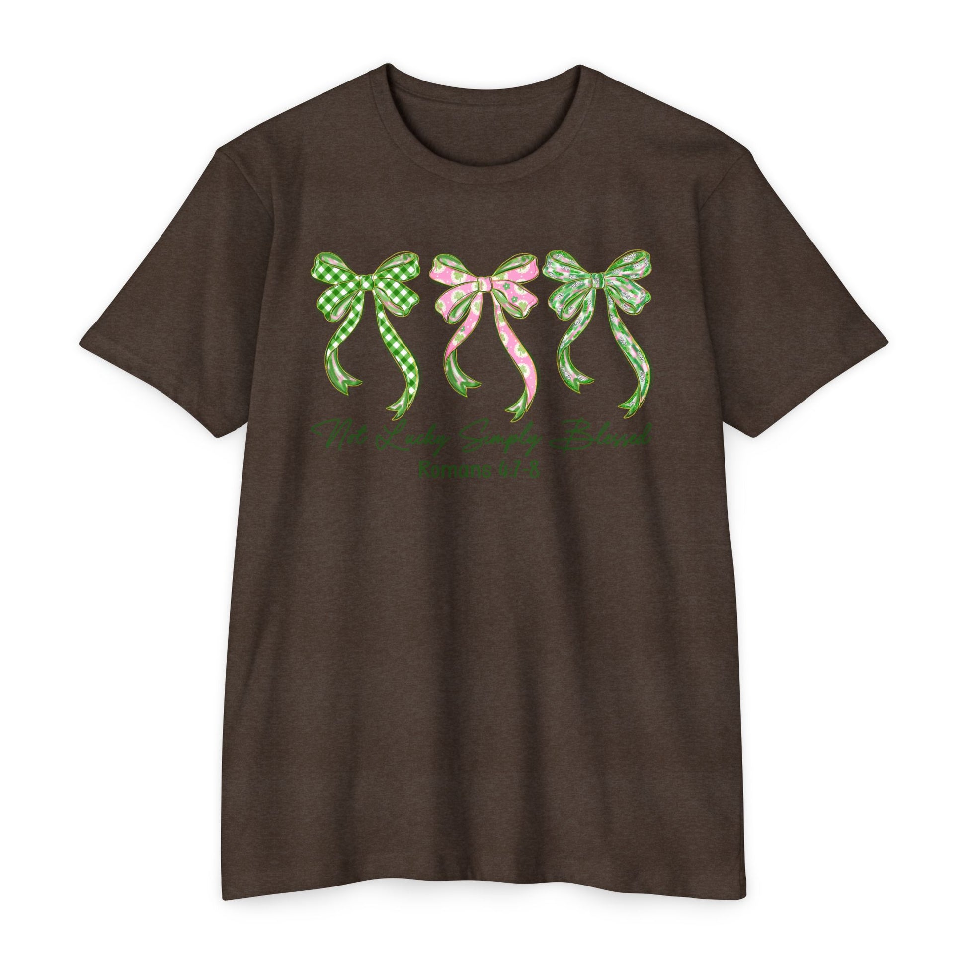 Soft, light, and quietly expressive — this tee carries a gentle charm. Three hand-drawn bows in coordinating green and pink patterns sit across the chest, their ribbon tails drifting like whispered promises. Beneath them, a delicate script reference adds a thoughtful, faith-leaning touch without shouting. The muted olive-gray base keeps the look grounded and wearable every day.
